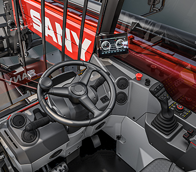 Trzy tryby jazdy: cztery koła skrętne, dwa koła skrętne, jazda krabem ‘ Poziomowanie podwozia +/-9 stopni ‘ W pełni proporcjonalny joystick z przełącznikiem jazdy przód / neutral / tył ‘ Karetka wideł szybkiego montażu SANY i widły 1200 mm ‘ Dodatkowe odpowietrzanie hydrauliczne z kabiny